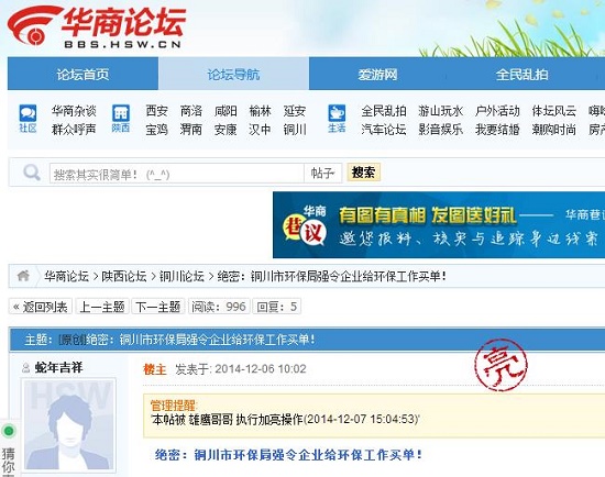 網(wǎng)曝銅川市環(huán)保局強(qiáng)令企業(yè)給環(huán)保工作買(mǎi)單