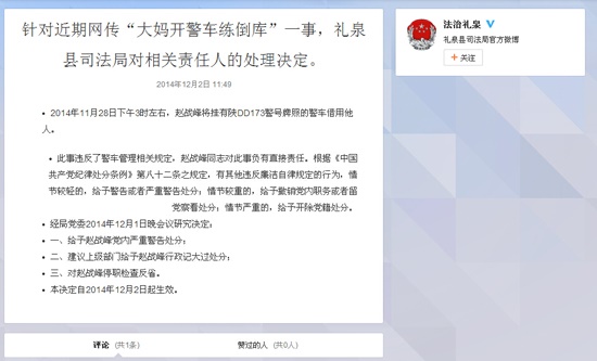 近日,有網(wǎng)友微博爆料:“一大媽開著警車在練車場練倒庫?!比A商報記者調(diào)查后發(fā)現(xiàn),涉事車輛系禮泉縣司法局史德司法所的警車。當(dāng)事司法所所長趙戰(zhàn)峰事后解釋了兩種版本,稱當(dāng)天車被朋友開到練車場。昨日經(jīng)調(diào)查,開警車練倒庫的“大媽”為所長親妹妹,因公車私用,趙戰(zhàn)峰被停職。
