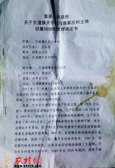 富縣人民政府下發(fā)的關(guān)于交道鎮(zhèn)天樂村和魯家莊村土地權(quán)屬糾紛的處理決定書