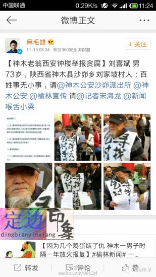 貪污犯劉如今多次指使他人報(bào)復(fù)毆打老人性質(zhì)極其惡劣、事實(shí)清楚!神木公安均置之不理,至今未傳喚問(wèn)詢(xún)打人者,沙峁所劉所長(zhǎng)說(shuō)“我們找不到人”,極力縱容貪污犯肆無(wú)忌憚報(bào)復(fù)舉報(bào)人!讓舉報(bào)人的人身安全遭受?chē)?yán)重侵害!性命沒(méi)有保障!我家人多次強(qiáng)烈要求并案刑事立案、嚴(yán)懲報(bào)復(fù)行兇主使,神木公安卻至今無(wú)人管?。?/p>