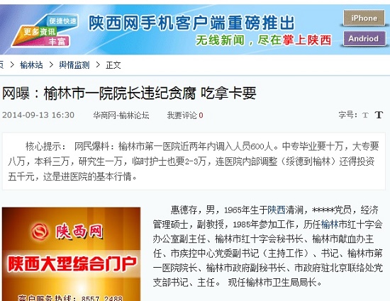 趙彥峰,榆林市第一醫(yī)院副院長,惠德存洗錢的好幫手,擔(dān)任院長助理時(shí),就分管醫(yī)院院辦人事大權(quán),近兩年內(nèi)調(diào)入人員600人。中專畢業(yè)要十萬,大專要八萬,本科三萬,研究生一萬,臨時(shí)護(hù)士也要2-3萬,連醫(yī)院內(nèi)部調(diào)整(綏德到榆林)還得投資五千元,這是進(jìn)醫(yī)院的基本行情。手中的錢計(jì)算一下,天文數(shù)字。兩位忠實(shí)走狗開始買官賣官,惠德存調(diào)入北京市,任榆林市駐北京要職。趙彥峰副院長不到一年半任職時(shí)間,就被人民幣推到榆林市第一醫(yī)院院長一職。這種以權(quán)謀私,吃,拿,卡,要的管理者,表面上看醫(yī)院在發(fā)展進(jìn)步,實(shí)際上害人民,對(duì)經(jīng)濟(jì)一般的重病患者雪上加霜,醫(yī)院的同志們?yōu)碾y降臨,高度戒備,防災(zāi),抗災(zāi),免災(zāi)。