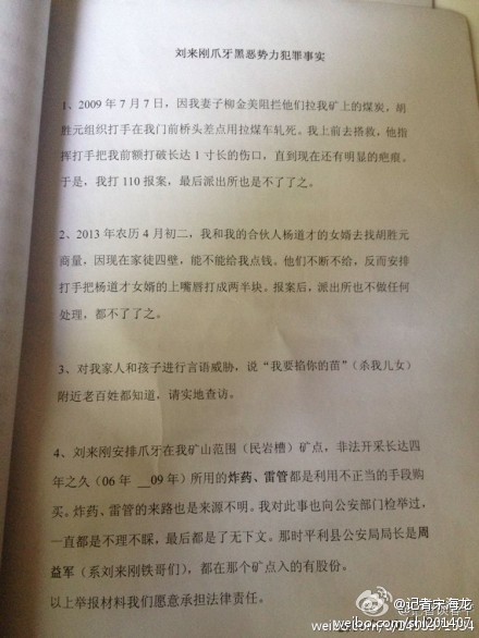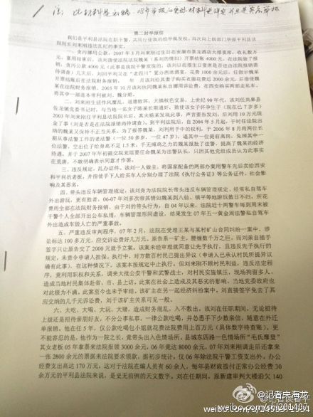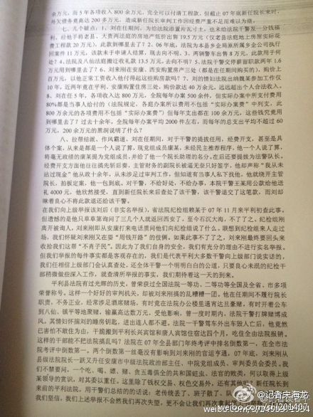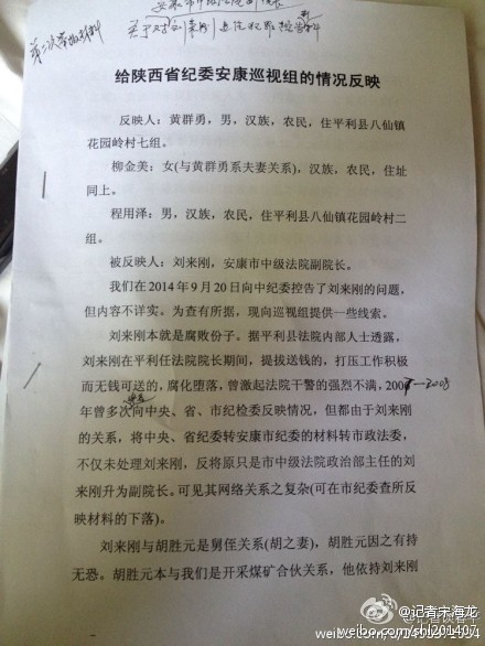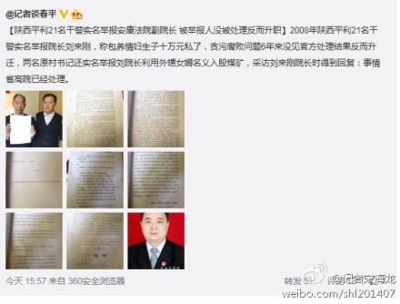 新浪微博爆料:【陜西平利21名干警實(shí)名舉報(bào)安康法院副院長(zhǎng)被舉報(bào)人沒(méi)被處理反而升職】2008年陜西平利21名干警實(shí)名舉報(bào)院長(zhǎng)劉來(lái)剛,稱包養(yǎng)情婦生子十萬(wàn)元私了,貪污腐敗問(wèn)題6年來(lái)沒(méi)見(jiàn)官方處理結(jié)果反而升遷,兩名原村書(shū)記還實(shí)名舉報(bào)劉院長(zhǎng)利用外甥女婿名義入股煤礦,采訪劉來(lái)剛院長(zhǎng)時(shí)得到回復(fù):事情省高院已經(jīng)處理。