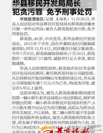 據新浪微博爆料:49歲的薛英勛是華縣移民局局長,去年12月曾因涉嫌貪污被立案后又被取保、監(jiān)視居住。今年7月華縣法院在開庭審理其貪污案時,薛英勛卻在“監(jiān)視居住”的情況下,威脅、毆打證人,被輿論關注且引發(fā)全國主流媒體熱議后才逮捕。然而,薛英勛貪污案在時隔四個月后的11月25日,華縣檢察院建議判5年以上,而華縣法院認為薛英勛雖有罪,卻判免于刑事處罰。此判決一經公開,立即召來眾多網民質疑與圍觀。陜西知名記者崔永利說:“這就意味著華縣黨委和政府還要再用好公仆”。