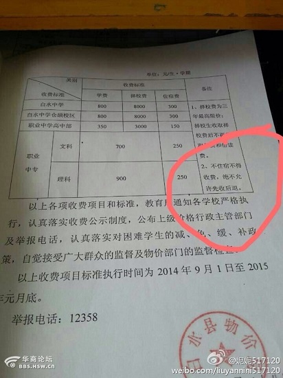 白水中學(xué)校方觀點(diǎn):是農(nóng)村戶口的統(tǒng)一收取300元人民幣,走讀生必須是城里的居民戶口(城里戶口必須在學(xué)校的區(qū)域劃分內(nèi))。