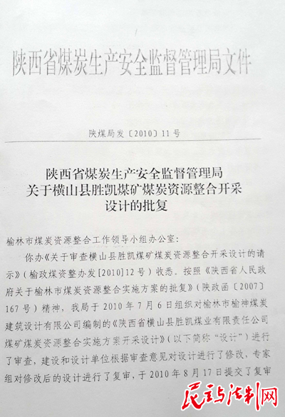 記者了解到,2013年2月5日,陜西省煤炭生產(chǎn)安全監(jiān)督局對勝凱公司的《煤礦煤炭資源整合實施方案開采設計變更》進行了批復;2013年3月5日,陜西省煤炭局【2013】23號文件也批復了勝凱煤礦將年產(chǎn)值45萬噸變?yōu)?0萬噸,并經(jīng)榆林市煤炭局轉(zhuǎn)發(fā)。