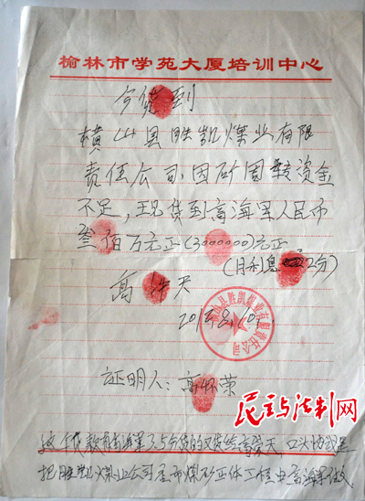 高海軍為此還找過橫山縣政府,領導給他的答復是走“司法程序”。但是,據(jù)高海軍了解,王耀斌在橫山縣背景復雜,走司法程序更是成本高昂。就這樣,雙方互相扯皮,高海軍又往返奔波一年,賬期卻隨著時間的推移而債臺高筑,高海軍的壓力也與日俱增。