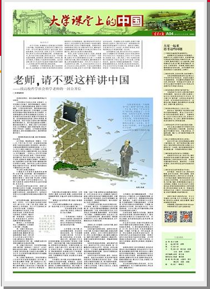 我們?nèi)滩蛔∫獙戇@封公開信,是想與老師們探討這樣幾個問題:應(yīng)該怎樣在大學(xué)課堂上客觀準(zhǔn)確地講授中國?如何把光明的心態(tài)跟專業(yè)的知識一起傳授給學(xué)生?怎樣在回答重大社會問題的同時提出解決問題的有效辦法?