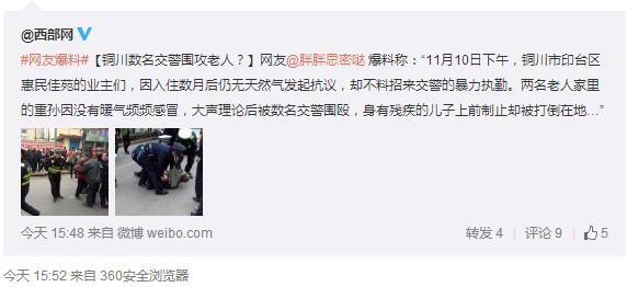 #網(wǎng)友爆料#【銅川數(shù)名交警圍攻老人?】網(wǎng)友@胖胖思密?chē)}爆料稱(chēng):“11月10日下午,銅川市印臺(tái)區(qū)惠民佳苑的業(yè)主們,因入住數(shù)月后仍無(wú)天然氣發(fā)起抗議,卻不料招來(lái)交警的暴力執(zhí)勤。兩名老人家里的重孫因沒(méi)有暖氣頻頻感冒,大聲理論后被數(shù)名交警圍毆,身有殘疾的兒子上前制止卻被打倒在地…”