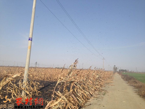 秸稈被焚燒的玉米地里有電線經(jīng)過
