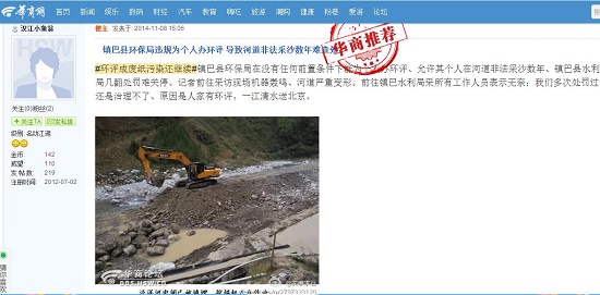 #環(huán)評(píng)成廢紙污染還繼續(xù)#鎮(zhèn)巴縣環(huán)保局在沒(méi)有任何前置條件下能為個(gè)人辦環(huán)評(píng)、允許其個(gè)人在河道非法采沙數(shù)年、鎮(zhèn)巴縣水利局幾翻處罰難關(guān)停。記者前往采訪現(xiàn)場(chǎng)機(jī)器轟鳴、河道嚴(yán)重變形。前往鎮(zhèn)巴水利局采所有工作人員表示無(wú)奈:我們多次處罰過(guò)還是治理不了、原因是人家有環(huán)評(píng)。一江清水送北京。