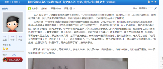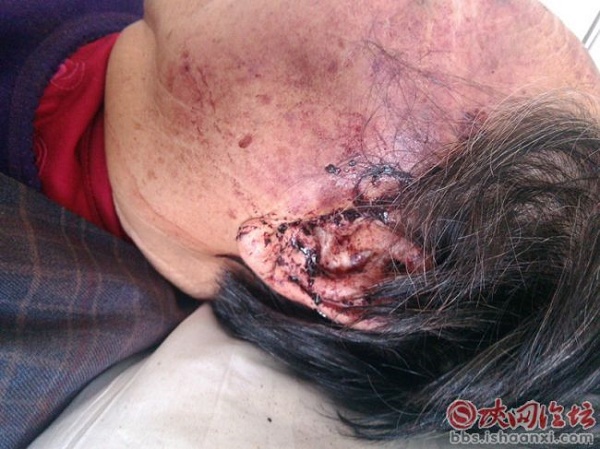 在病房里,受傷老太李某閉著眼睛向記者訴說自己的遭遇:2012年3月份,他們通過自家的親戚李永成做擔(dān)保,向神木縣寶鼎金屬鑄造有限公司的總經(jīng)理薛廣彪以月3分利貸款78萬,12年的利息已付清,但從13年開始,薛廣彪將不再還款,他們多次催促,都無濟(jì)于事。今年秋季因?qū)W生上學(xué),李大娘及其兒子康某又多次向薛總索要欠款,最后薛總在10月25日給他們打電話,讓其來家里取。晚上8點多,薛總回家后,卻將7旬老太從凳子上拉下來毆打。老太左手腕被踩傷,后用菜刀平面在老人臉上亂拍,牙齒被打掉幾顆,左耳朵直流鮮血,右嘴角有一道深深的傷疤,整個臉腫脹著。老太無力地說,“他用菜刀抵著我脖子說,你死哈(下)了?一兩個我埋起了?!眱鹤涌的尺M(jìn)屋后,在無防備的情況下,被薛某用菜刀砍向頭部,“醫(yī)生說,血已經(jīng)滲到大腦里頭了,骨頭也裂開了縫”,康某妻子說。