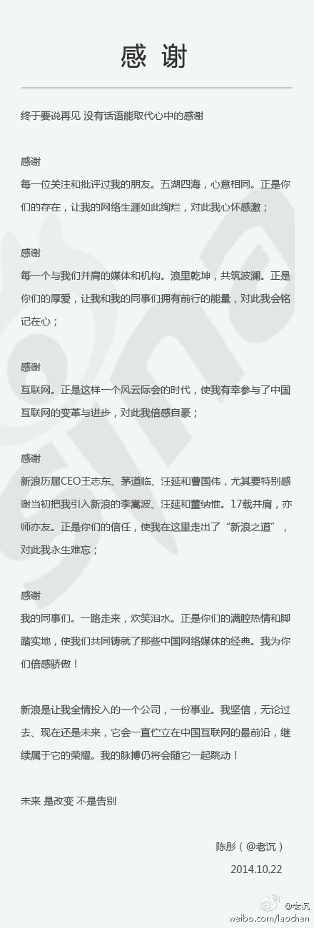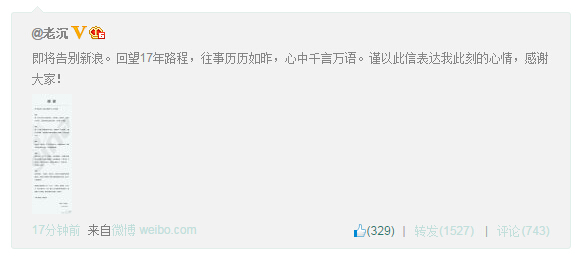 即將告別新浪?;赝?7年路程,往事歷歷如昨,心中千言萬語。謹(jǐn)以此信表達(dá)我此刻的心情,感謝大家!