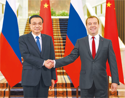 梅德韋杰夫熱烈歡迎李克強訪俄并舉行兩國總理第十九次定期會晤。梅德韋杰夫表示,當前俄中關(guān)系的水平非常高,兩國是關(guān)系緊密的朋友和伙伴,雙邊合作取得豐碩成果。俄方愿同中方共同努力,發(fā)揮兩國經(jīng)濟發(fā)展的巨大優(yōu)勢和潛力,推動雙方相互開展大規(guī)模投資,加強聯(lián)合研發(fā)與生產(chǎn),推進交通基礎(chǔ)設(shè)施、航空領(lǐng)域等合作,努力使俄中全面戰(zhàn)略協(xié)作伙伴關(guān)系在更高水平上發(fā)展。