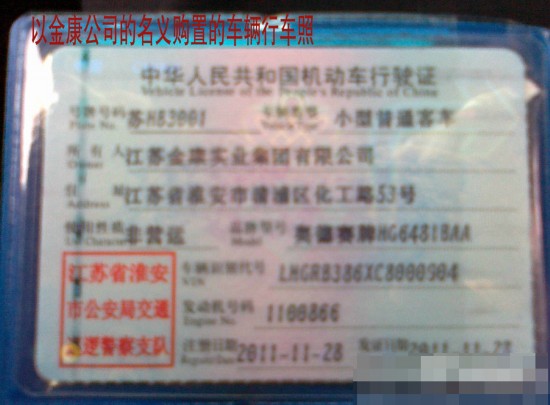 圖中文字為:以金康公司的名義購置的車輛行車照。