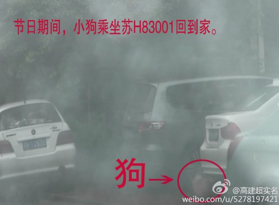 記者了解到,高建超今年40歲,1996年參加工作,直到2011年4月都在淮安市清浦公安分局分局工作,隨后調(diào)入淮安市公安局。公開資料顯示,被舉報人曹興龍現(xiàn)任清浦區(qū)區(qū)委常委、公安分局局長,今年51歲,2010年6月由淮安市公安局調(diào)任青浦區(qū)公安分局擔任局長。圖中文字為:節(jié)日期間,小狗乘坐蘇H83001回到家。