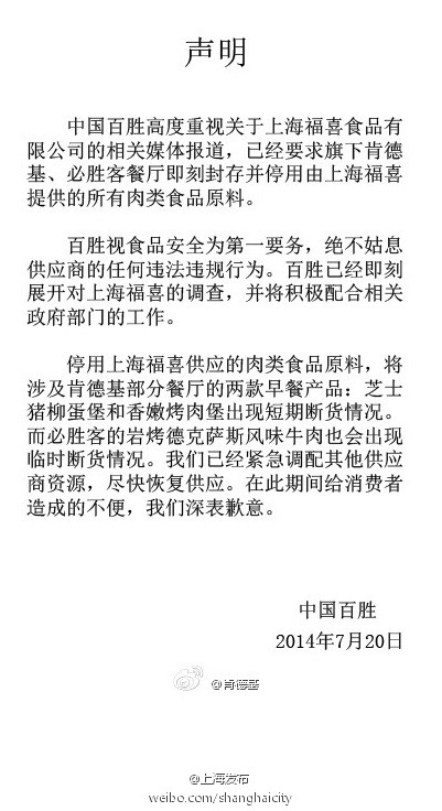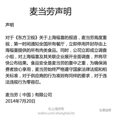 @上海發(fā)布:【麥當(dāng)勞、肯德基聲明:立即停用并封存上海福喜提供的所有肉類原料】#關(guān)注#@麥當(dāng)勞將立即停用和封存上海福喜提供的所有肉類食品,并將對相關(guān)企業(yè)全面調(diào)查,盡快公布結(jié)果。@肯德基將封存和停用相關(guān)原料,并展開調(diào)查??系禄闹ナ控i柳蛋堡、香嫩烤牛堡,必勝客的巖烤德克薩斯風(fēng)味牛肉將出現(xiàn)短期斷貨。
