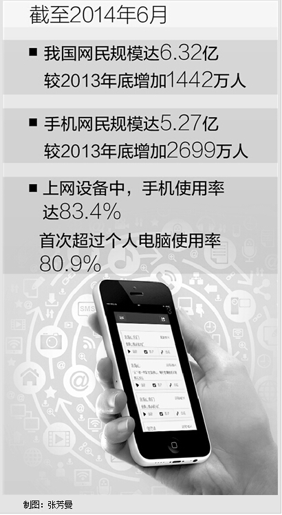本報(bào)北京7月21日電 (記者李昌禹)中國(guó)互聯(lián)網(wǎng)信息中心(CNNIC)今日發(fā)布的《第34次中國(guó)互聯(lián)網(wǎng)絡(luò)發(fā)展?fàn)顩r統(tǒng)計(jì)報(bào)告》顯示,截至今年6月,我國(guó)手機(jī)網(wǎng)民達(dá)5.27億,較2013年底增加2699萬(wàn)人,手機(jī)上網(wǎng)使用率達(dá)83.4%,首次超過(guò)個(gè)人電腦(僅包括臺(tái)式機(jī)和筆記本,不包含平板電腦等新興個(gè)人終端設(shè)備)。