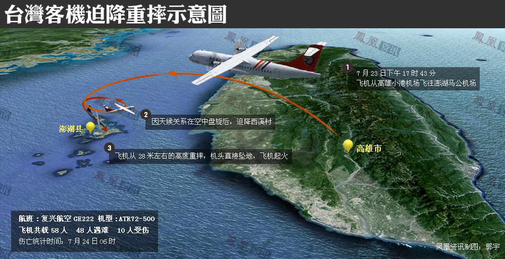 出事的復興航空班機,原定下午4時由高雄起飛前往馬公,受天候影響延遲到5時43分才出發(fā), 客機上共有58人,包括54名乘客及4名機組員,疑因天候狀況不佳,抵達馬公后第1次降落失敗重新升空,盤旋后再度降落又失敗,撞向民居起火。