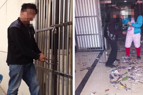 左圖為相關人員將榆林城市客運管理辦公室的大門鎖上,右圖為榆林城市客運管理辦公室被相關人員打砸現(xiàn)場。