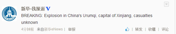 據(jù)新華社英文@新華-我報道,新疆烏魯木齊發(fā)生爆炸,傷亡不明。