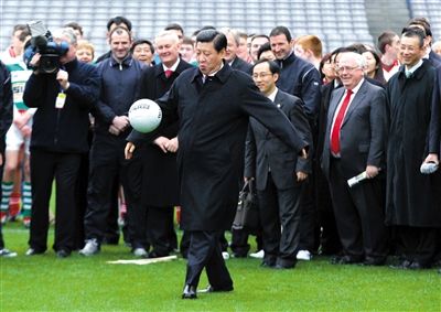 2012年2月訪問愛爾蘭時,習(xí)近平在都柏林的第一項(xiàng)活動,便是參觀當(dāng)?shù)匾粋€體育運(yùn)動協(xié)會。在這次參觀中,他再一次走上球場草坪,饒有興趣地展示了自己的腳法。