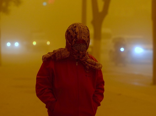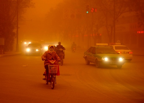 4月23日,一輛拉載公路施工人員的三輪車在沙塵暴中行駛在酒泉市瓜州縣城郊的公路上。當(dāng)日,甘肅省酒泉市的敦煌市、瓜州縣等地遭受特強(qiáng)沙塵暴襲擊,最小能見(jiàn)度不足20米。當(dāng)日下午,酒泉市氣象臺(tái)發(fā)布沙塵暴紅色預(yù)警信號(hào)。新華社記者聶建江攝