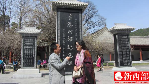 中央人民廣播電臺、中國國際廣播電臺記者雷愷(左)在軒轅廟香港回歸紀念碑前采訪海外華人華僑公祭黃帝陵謁祖團秘書長徐亞鴿女士。王順利攝