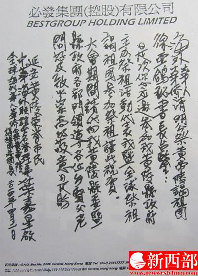 延安黃陵榮譽市民、中華海外聯(lián)誼會名譽理事、全球海外華人華僑公祭黃帝陵謁祖團總團長葉嘉星先生致海外華人華僑清明公祭黃帝陵謁祖團徐亞鴿秘書長臺鑒:“是次您應邀參加我黃陵縣政府主辦祭祖活動代表我暨全球祭祖謁祖團參加祭祖謹此祝賀。大會期間請代向我黃陵縣委暨縣政府各部門領導各位鄉(xiāng)賢父老問好及致以崇高的敬意是盼?!?王順利攝