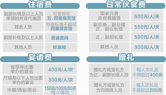 日?;锸迟M(fèi)方面,國家元首、政府首腦級(jí)每人每天600元;副總統(tǒng)、副總理和正、副議長級(jí)每人每天550元;正、副部長級(jí)每人每天500元;其他人員每人每天300元。