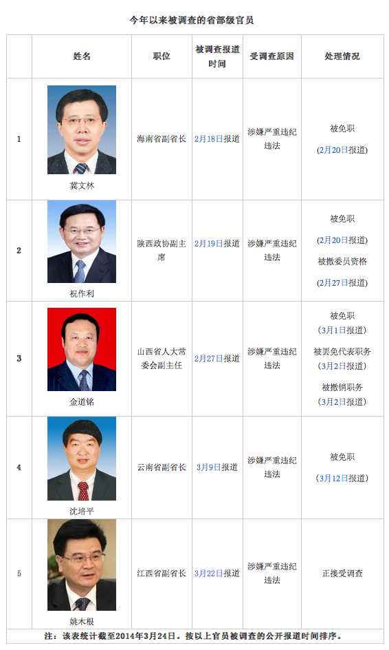 人民網(wǎng)北京3月24日電(記者仝宗莉)中紀(jì)委監(jiān)察部網(wǎng)站3月22日通報,江西省副省長姚木根涉嫌嚴(yán)重違紀(jì)違法,目前正接受組織調(diào)查。姚木根是今年以來第5位被調(diào)查的省部級官員,也是十八大以來第23位被調(diào)查的省部級官員。