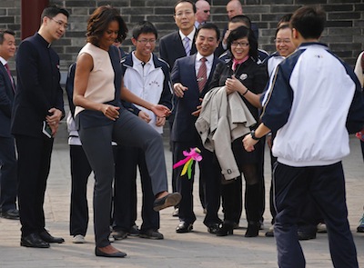 米歇爾米歇爾在西安古城墻上踢毽子。