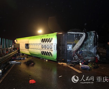 人民網(wǎng)重慶3月25日電(王嫚) 3月25日零點(diǎn)30分左右,G65包茂高速黔江境內(nèi)進(jìn)城方向阿蓬江至濯水路段發(fā)生重大道路交通事故,1輛牌照為川E34436的客車(從廣州順德開(kāi)往四川瀘州)發(fā)生側(cè)翻,接著被后方駛來(lái)的渝BR2602貨車追尾碰撞,并導(dǎo)致其后方同向行駛的多輛車追尾。截至25日9時(shí),已造成15人死亡,56人不同程度受傷。