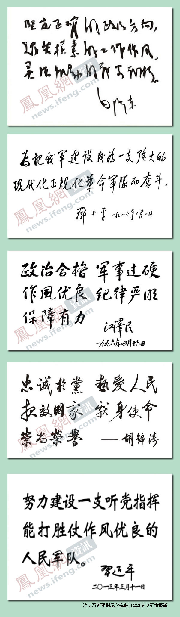 原標(biāo)題 經(jīng)習(xí)近平主席和軍委領(lǐng)導(dǎo)批準(zhǔn) 全軍和武警部隊(duì)各級(jí)黨委(支部)會(huì)議室統(tǒng)一懸掛毛澤東鄧小平江澤民胡錦濤習(xí)近平重要題詞指示