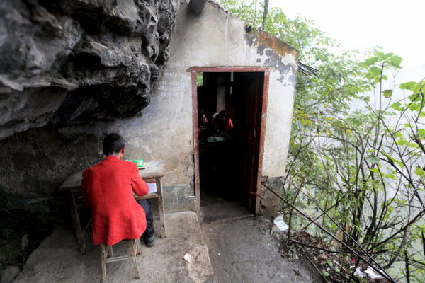 左邊是絕壁,右邊是懸崖,這樣一個讓人“倒吸涼氣”的地方,卻是袁老師的“辦公室”。每天袁老師就坐在教室門口備課、批改作業(yè),這套陳舊的桌椅就是他在學校的全部財產。