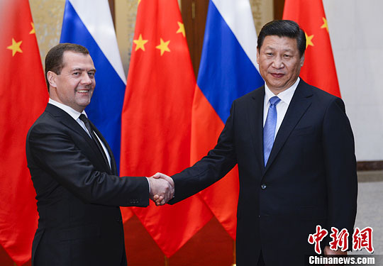 中國國家主席習近平22日在人民大會堂會見俄羅斯總理梅德韋杰夫。