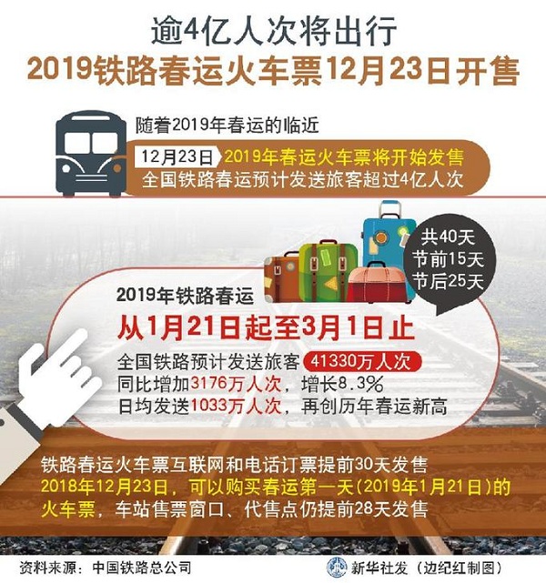 鐵路總公司有關(guān)部門負(fù)責(zé)人介紹,2019年鐵路春運(yùn)從1月21日起至3月1日止,共40天,節(jié)前15天,節(jié)后25天。全國鐵路預(yù)計(jì)發(fā)送旅客41330萬人次,同比增加3176萬人次,增長8.3%,日均發(fā)送1033萬人次,再創(chuàng)歷年春運(yùn)新高。