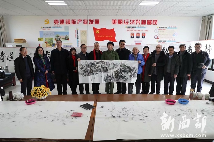西安郭氏書畫院名譽院長曹濱洲(左七)為郭小鵬(左六)贈送水墨畫《輕舟已過萬重山》