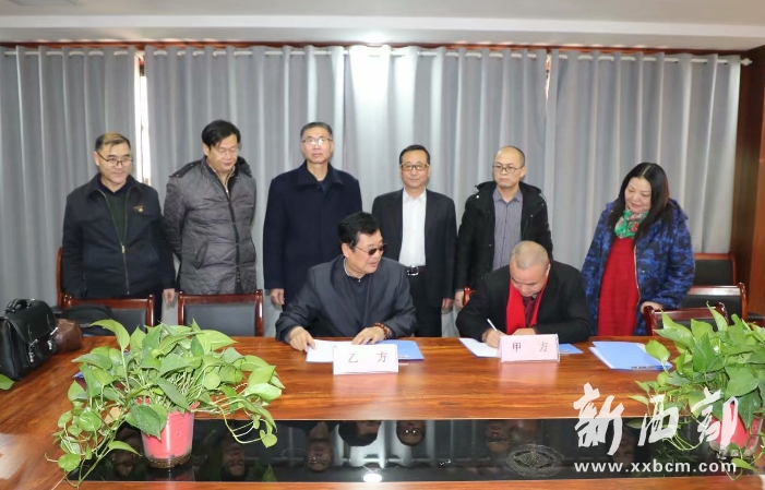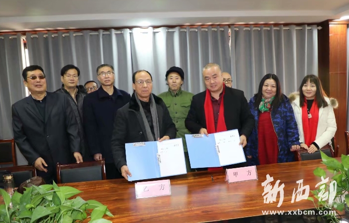 郭氏專業(yè)委員副會長郭大凱(前左)與陜西蓬騰農(nóng)產(chǎn)品有限公司總經(jīng)理郭小鵬雙方就合作建立書畫工作室舉行簽約儀式