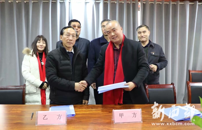 郭氏專業(yè)委員副會長郭顯文(前左)與陜西蓬騰農(nóng)產(chǎn)品有限公司總經(jīng)理郭小鵬雙方就合作定制專用水舉行簽約儀式