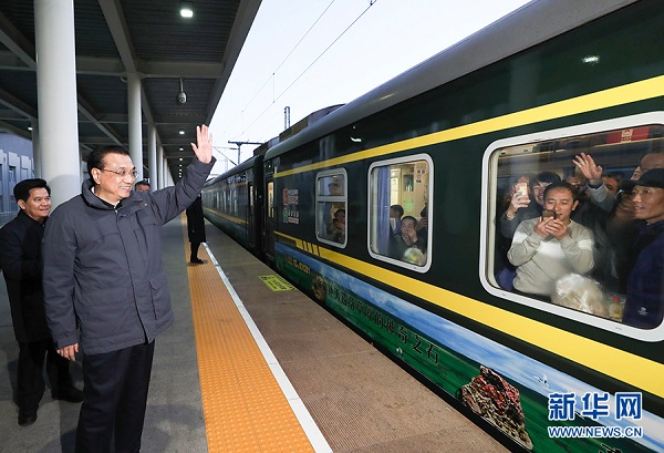 李克強來到集寧南火車站,登上停靠的綠皮列車察看春運保障。乘客們喜出望外,紛紛向總理問好,李克強特別詢問返鄉(xiāng)農(nóng)民工工資是否拿到、節(jié)后外出工作是否有保證。得知列車要經(jīng)停26站、開行30多小時,李克強說,我們既要繼續(xù)發(fā)展高鐵,也要有停站多、票價低的普通列車,以滿足群眾不同需求。李克強還聽取了內(nèi)蒙古高鐵建設(shè)打算,要求有關(guān)部門支持,帶動區(qū)域協(xié)調(diào)發(fā)展和民生改善。