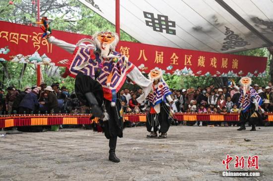 資料圖:西藏民眾羅布林卡賞藏戲迎雪頓。何蓬磊 攝