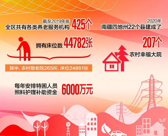 “十三五”期間,新疆在養(yǎng)老服務基礎建設、功能發(fā)揮和服務水平等方面成效顯著,特別是農(nóng)村養(yǎng)老服務兜底保障網(wǎng)越織越密。截至2019年底,全疆共有各類養(yǎng)老服務機構425個,擁有床位數(shù)44782張。其中,農(nóng)村敬老院265所,床位24861張。