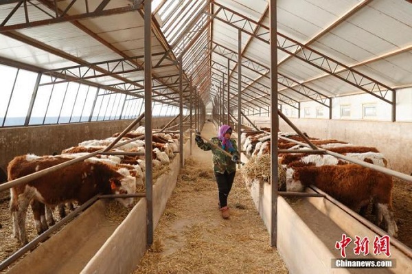 資料圖:工作人員在牛羊交易市場的牛寄養(yǎng)棚內(nèi)喂牛。中新社記者 韓海丹 攝