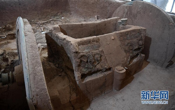 這套青銅輪牙馬車2014年出土于陜西省寶雞市岐山縣周原遺址。出土?xí)r,這套長3.13米、寬2.7米、高1.5米的馬車在黃土中被壓成了上千片碎片,車頭部位還有4匹馬的遺骸。