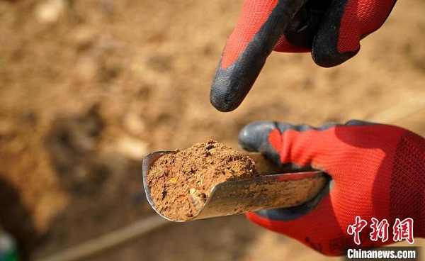 圖為考古勘探發(fā)現(xiàn)的“五花土”,可為尋找墓葬提供線索。 應(yīng)騰 攝