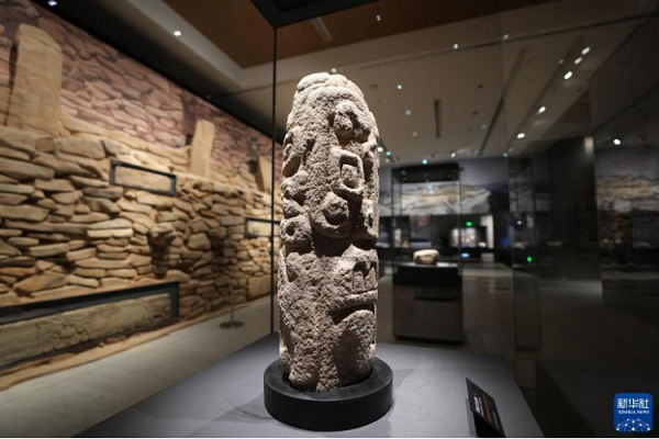 這是陜西考古博物館展出的神木石峁遺址皇城臺出土的神面立柱石雕(4月16日攝)。 新華社記者 李一博 攝