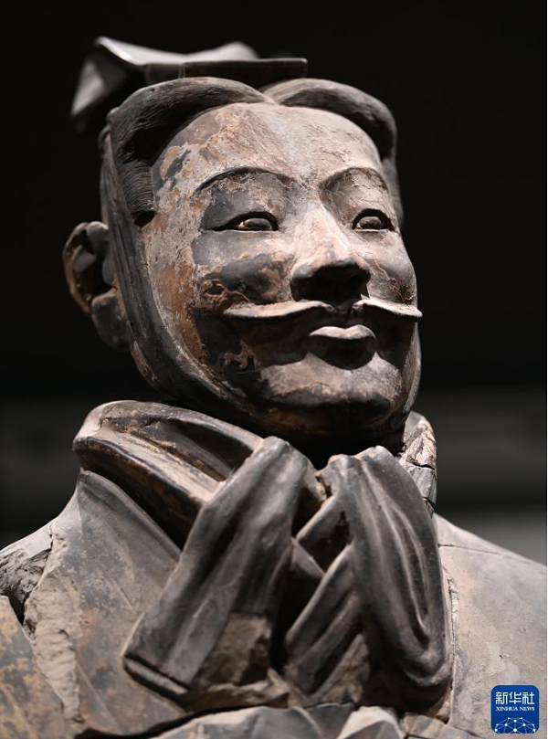 這是陜西考古博物館展出的秦始皇帝陵園陪葬坑出土的文吏俑(4月16日攝)。 新華社記者 李一博 攝