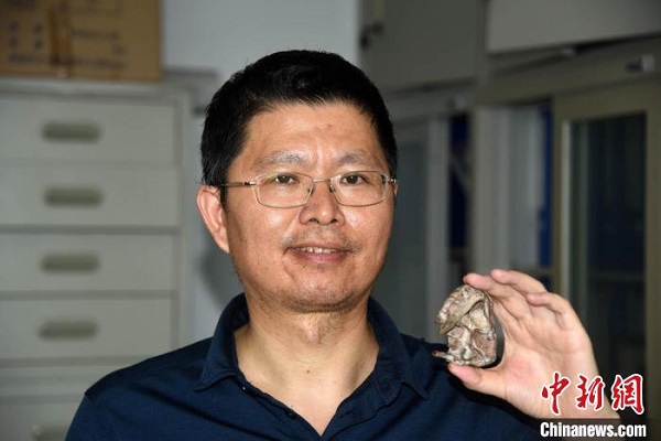 劉俊研究員展示介紹“劉氏真錢伯獸”化石標(biāo)本。 中新社記者 孫自法 攝