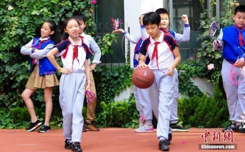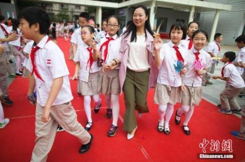 資料圖:教師節(jié),老師們牽著學(xué)生的手走過(guò)紅地毯步入校園。張?jiān)?攝