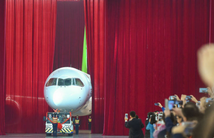 我國自主研制的C919大型客機首架機,在中國商飛公司總裝制造中心浦東基地廠房內(nèi)正式下線(2015年11月2日攝)。新華社發(fā)(裴鑫 攝)